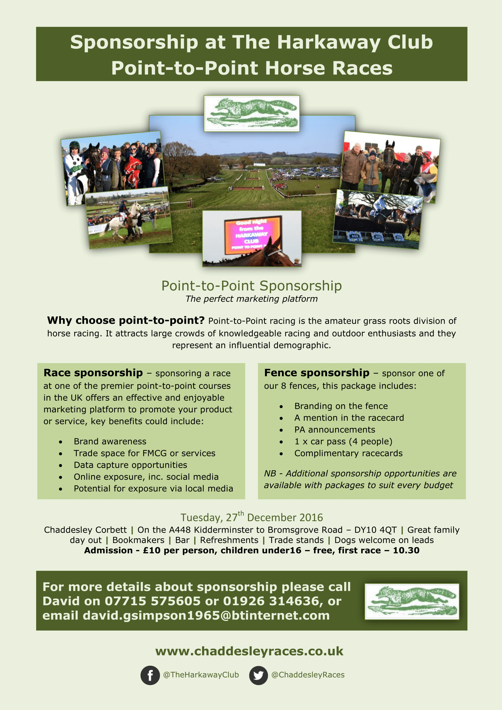 Sponsorship Opportunities: Harkaway Club Point-to-Point 27/12/2016 November 1, 2016 Chaddesley Races Chaddesley Corbett Racecourse, Harkaway, Latest News 0 Comments 2016Chaddesley Corbett RacecoursePoint-to-PointSponsorship Share This Tweet Share Plus one Share